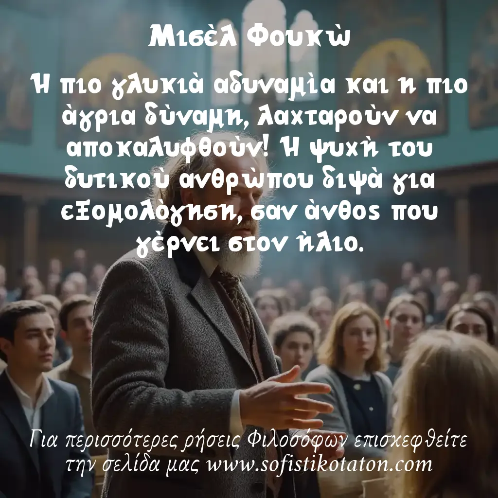 Ο Μισέλ Φουκώ γεννήθηκε στις 15 Οκτωβρίου 1926 στο Πουατιέ της Γαλλίας και πέθανε στις 25 Ιουνίου 1984 στο Παρίσι. Υπήρξε κορυφαίος φιλόσοφος, ιστορικός και κοινωνικός θεωρητικός, γνωστός για την ανάλυση της σχέσης μεταξύ γνώσης και εξουσίας. Στο έργο του ανέπτυξε τις έννοιες της «βιοεξουσίας», της «κυβερνησιμότητας» και της «εκτελεστικότητας του λόγου», εξετάζοντας πώς οι θεσμοί (όπως η φυλακή, η ψυχιατρική και η σεξουαλικότητα) διαμορφώνουν τα υποκείμενα. Με έργα όπως Discipline and Punish και The History of Sexuality, εισήγαγε τις μεθόδους της «αρχαιολογίας» και της «γενεαλογίας» για την ιστορική ανάλυση των ιδεών. Δίδαξε στο Collège de France και επηρέασε βαθιά τη φιλοσοφία, την κοινωνιολογία και τη θεωρία των μέσων